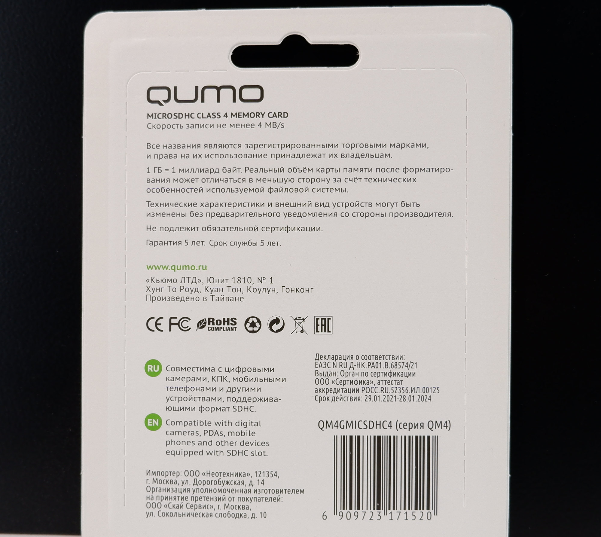 Карта памяти microSD 4GB Qumo