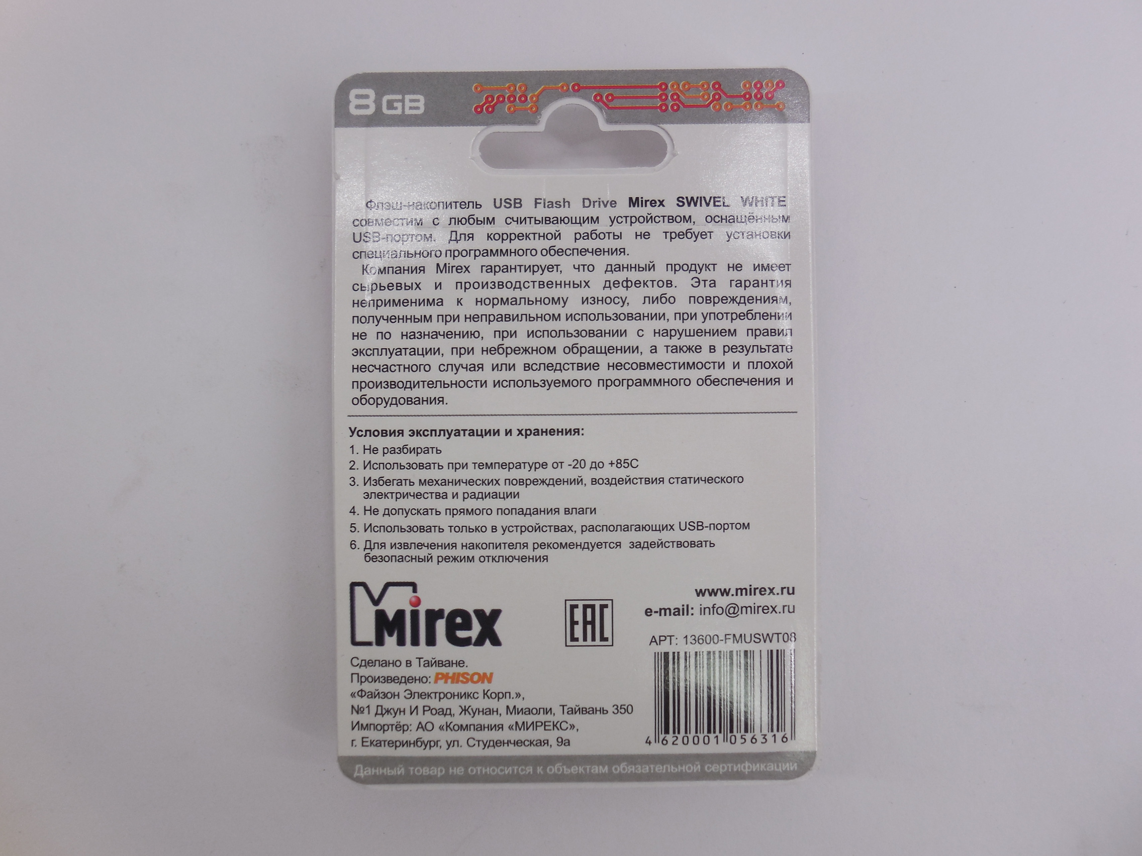 Флэш накопитель USB2.0 8GB Mirex Swivel White/ скорость чтения 10MB/s, скорость записи 5MB/s/ USB2.0/ BOX НОВАЯ