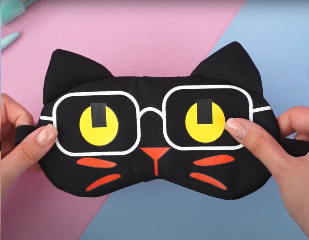 Маски шьют из качественного светонепроницаемого текстиля. В качестве украшения используется искусственный мех, бантики, принты мультяшных персонажей. Изнаночная сторона выполнена из приятного на ощупь материала. Это может быть искусственный или натуральный шелк, мягкий хлопок. Крепкая тесемка надежно удерживает аксессуар на лице, чтобы предотвратить сползание. Вместо тесемки используют также широкую резинку.