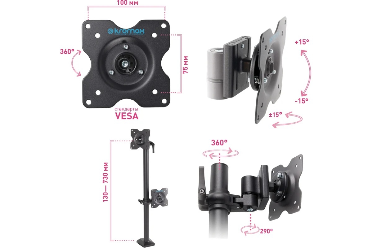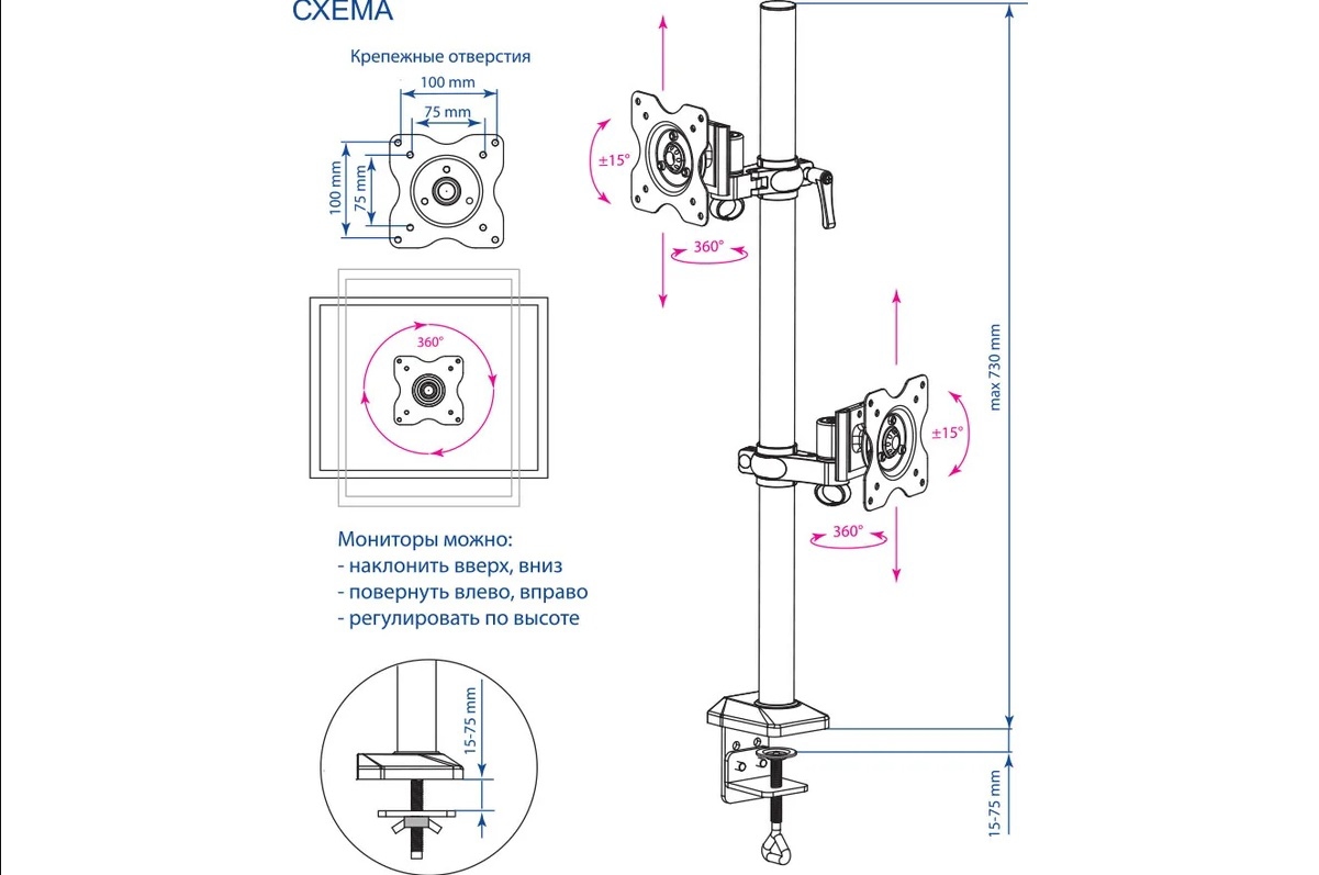 Высота: 730 мм — высота мачты над столом, VESA 75 x 75, VESA 100 x 100, Толщина столешницы: 15 — 75 мм