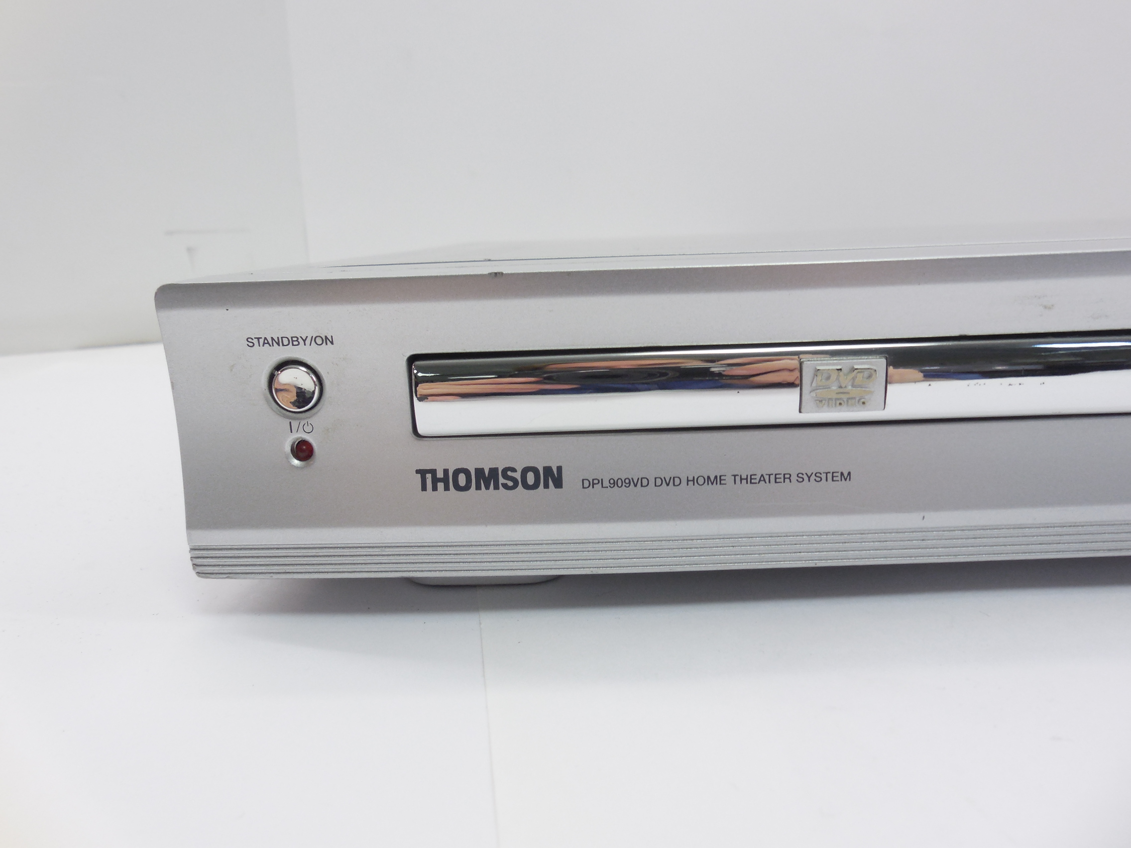 Бытовой ресивер с DVD Thomson DPL-909VD, мощность 90Вт, воспроизведение DVD и MP3, FM/AM радио, входы 2x AUX стерео RCA, выход 5.1 на колонки и сабвуфер — зажимы, линейный выход стерео RCA, выход видео композитный RCA, S-video и SCART, без ПДУ