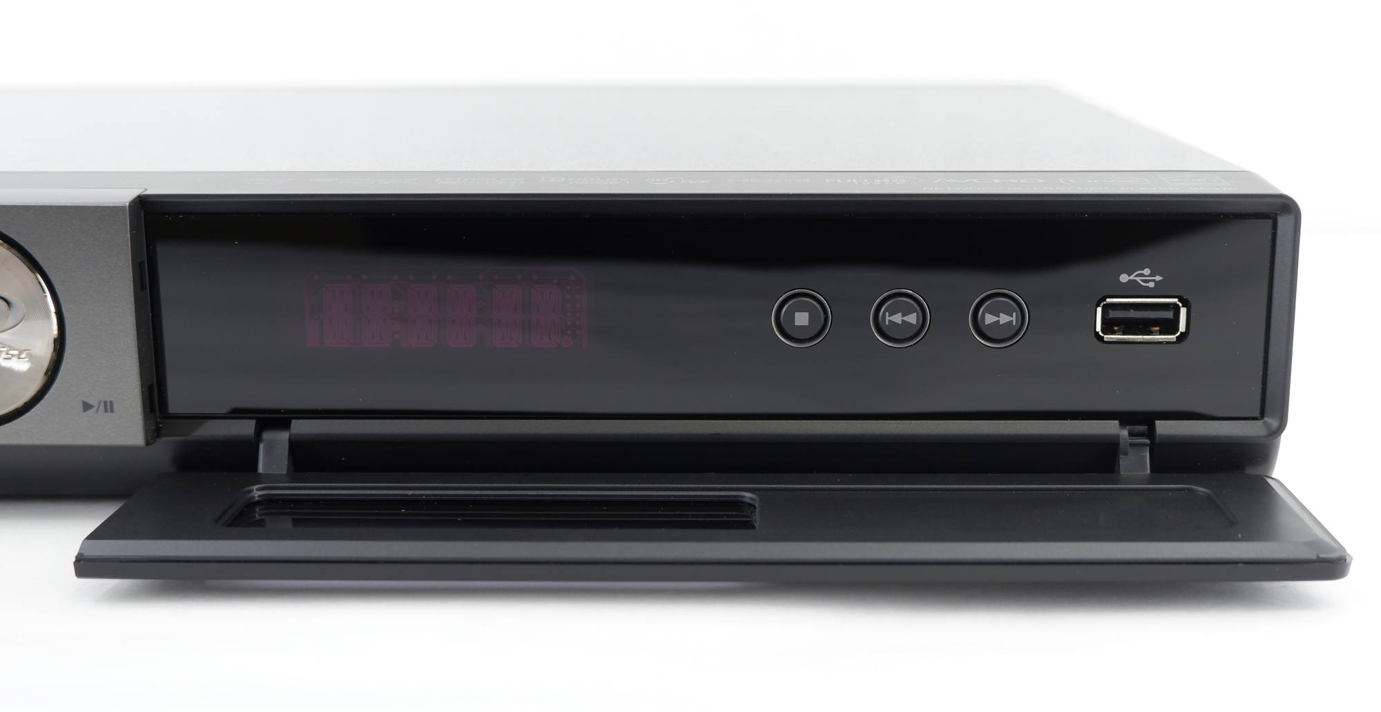 Проигрыватель сразу привлекает к себе внимание стильным и элегантным дизайном, в котором классическая цветовая гамма черного лака эффектно сочетается с хромированными деталями отделки. Управление режимами работы плеера осуществляется с помощью мультифункциональной хромированной кнопки. Ее центральную часть занимает выключатель питания, обрамленный по контуру матовым ободом, служащим одновременно и сетевым индикатором. Цвет его свечения изменяется в зависимости от содержимого загрузчика диска. Если вы слушаете CD, кнопка подсвечивается фиолетовым тоном, при работе с DVD, цвет меняется на оранжевый. Ну а Blu-ray носителю, конечно, соответствует голубой цвет. Информация о режимах работы плеера отображается на люминесцентном дисплее с ненавязчивым зелено-голубым свечением.