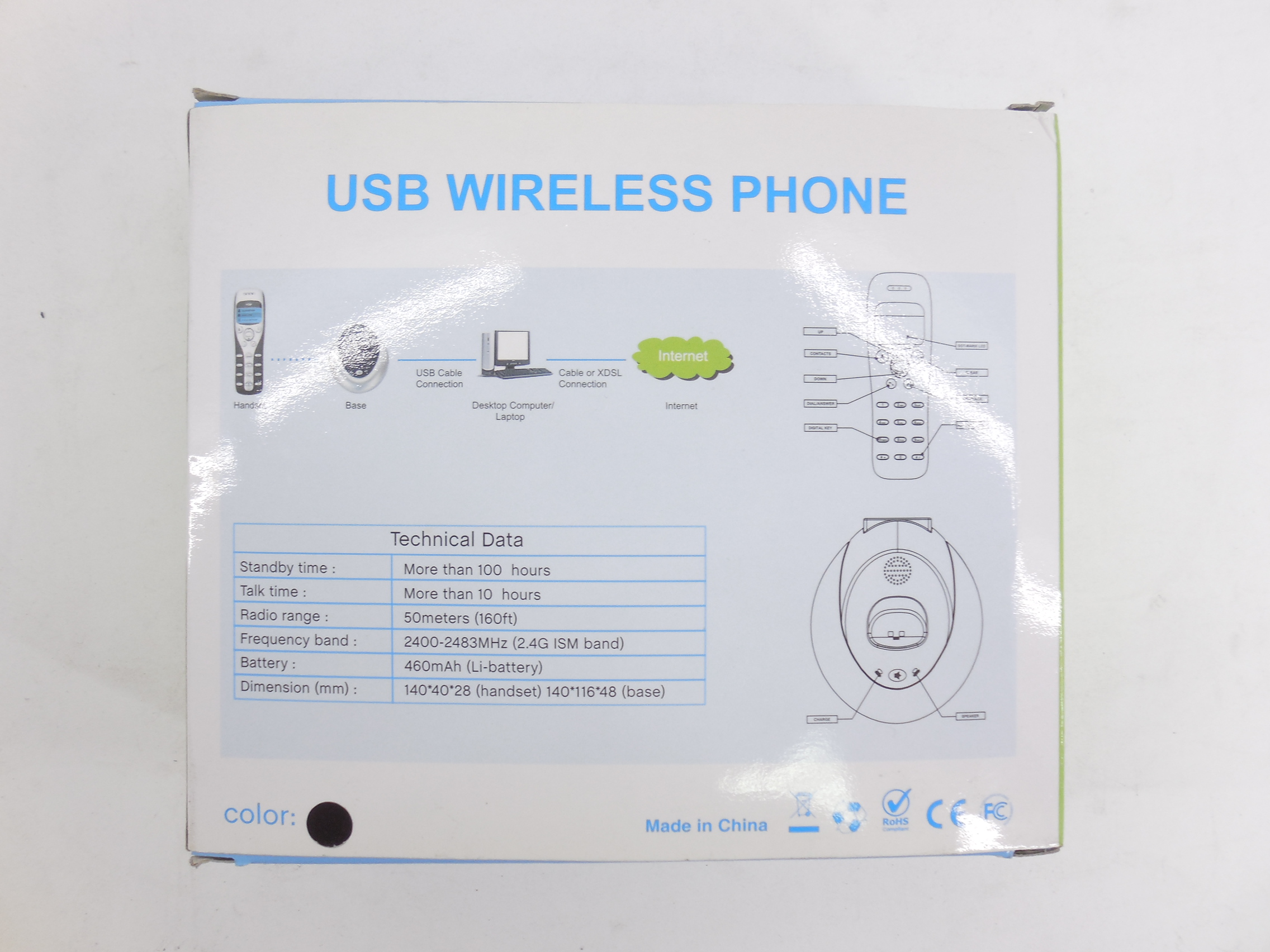 Беспроводной USB телефон для компьютера, радиус действия 50 метров, док-станция, USB кабель, акб до 10ч в режиме разговора, ВОХ
