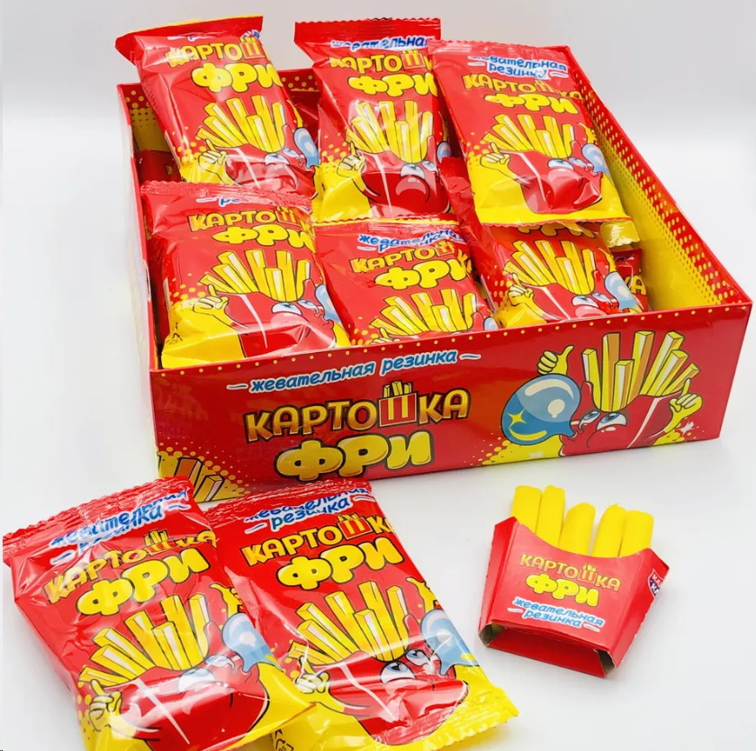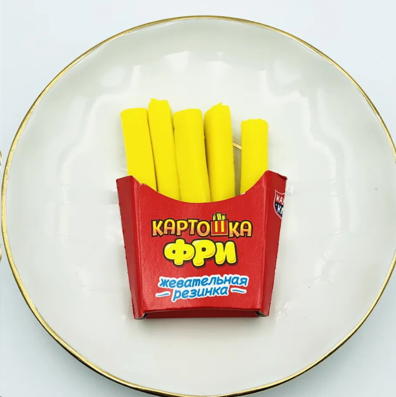 Жевательная резинка в виде картошки фри. Имеет в составе сахар, пищевой ароматизатор, искусственные добавки.
