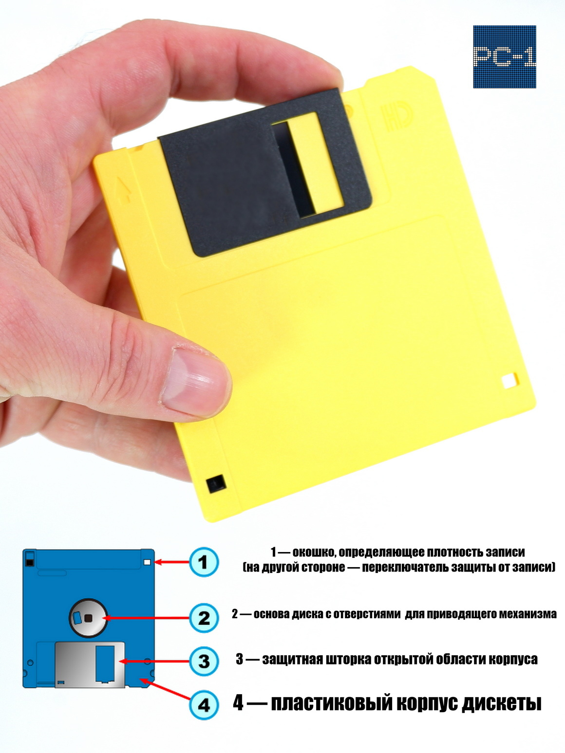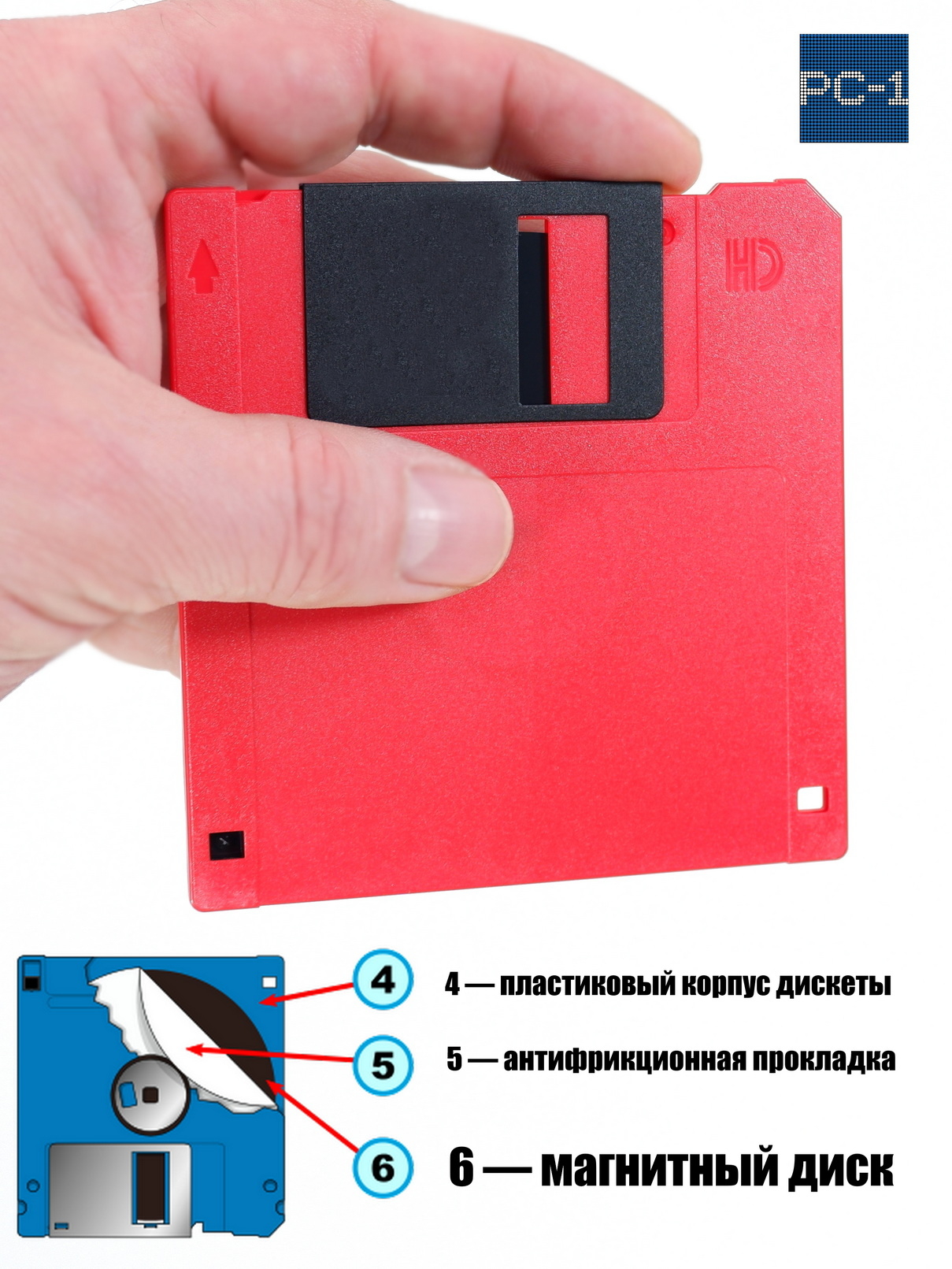 На фото 1 — окошко, определяющее плотность записи (на другой стороне — переключатель защиты от записи); 2 — основа диска с отверстиями для приводящего механизма; 3 — защитная шторка открытой области корпуса; 4 — пластиковый корпус дискеты; 5 — антифрикционная прокладка; 6 — магнитный диск; 7 — область записи (красным условно выделен один сектор одной дорожки).