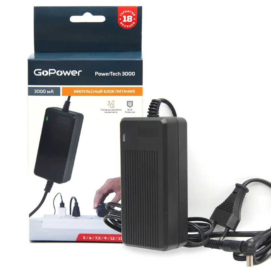 Блок питания 3-12 вольт 3.0A GoPower PowerTech 3000, универсальный, импульсный стабилизированный, 7 сменных разъемов