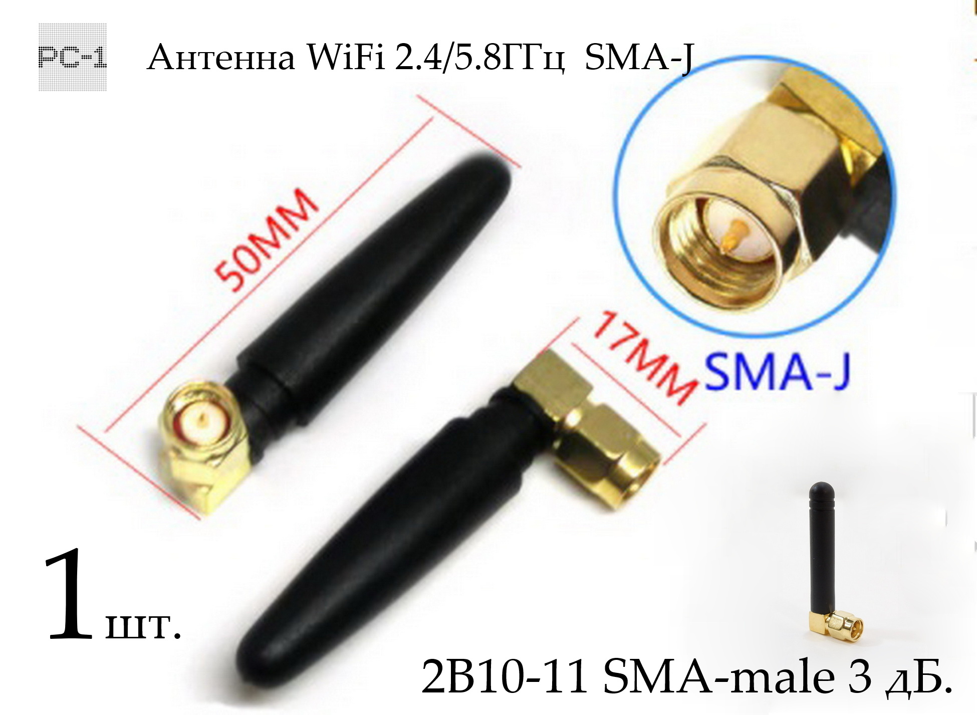 Антенна WiFi 2.4/5.8ГГц штыревая (SMA-J), 2B10-11 SMA-male 3 дБ. Длина — 50мм. Универсальная, подходит к большинству устройств